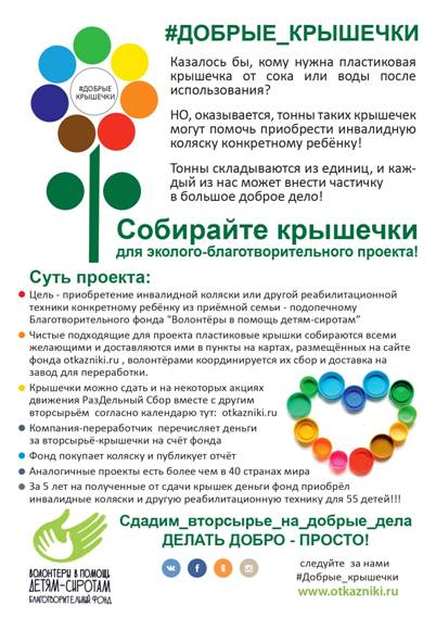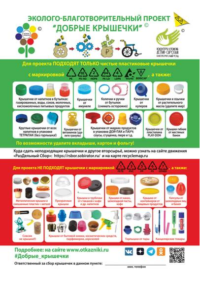 На предприятиях и в подьездах жилых домов волонтеры устанавливают боксы для сбора пластиковых крышек. Сбор проходит в рамках эколого-благотворительного проекта "Добрые крышечки" для помощи детям с ОВЗ, воспитывающимя в приемных семьях.