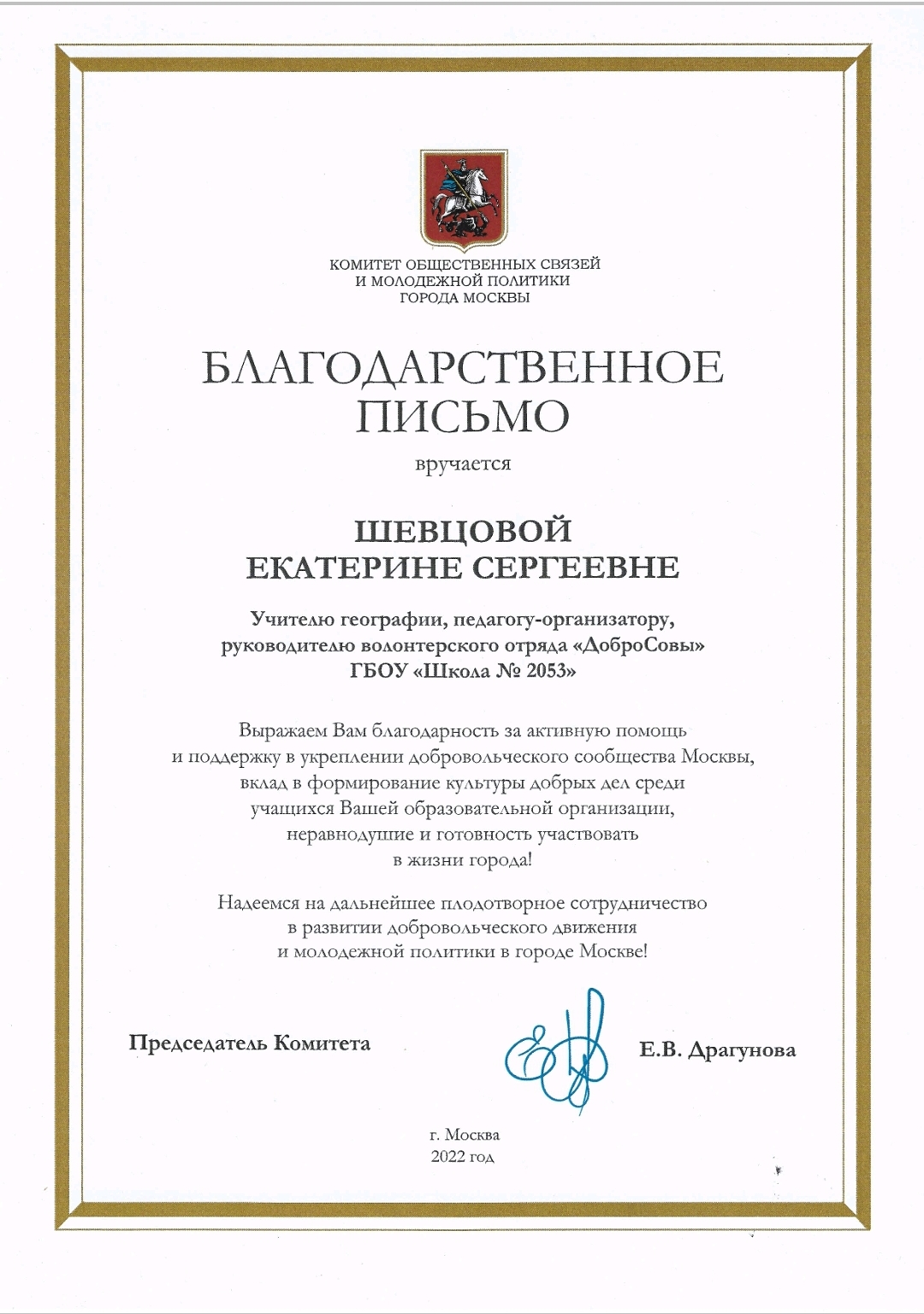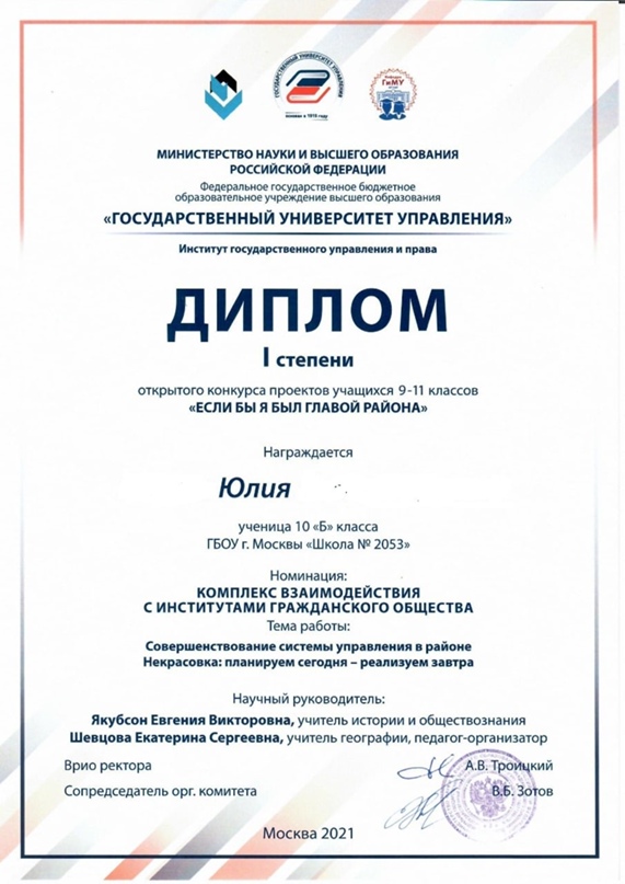 В 2021 году обучающаяся 10 класса ГБОУ Школа 2053 и тим-лидер волонтерского отряда «ДоброСовы» Яицкая Юлия представила свои разработки и предложения на открытом конкурсе проектов среди учащихся 9-11 классов «Если бы я был главой района» при Государственном университете управления, и данная работа признана одной из лучших и удостоена диплома I степени.