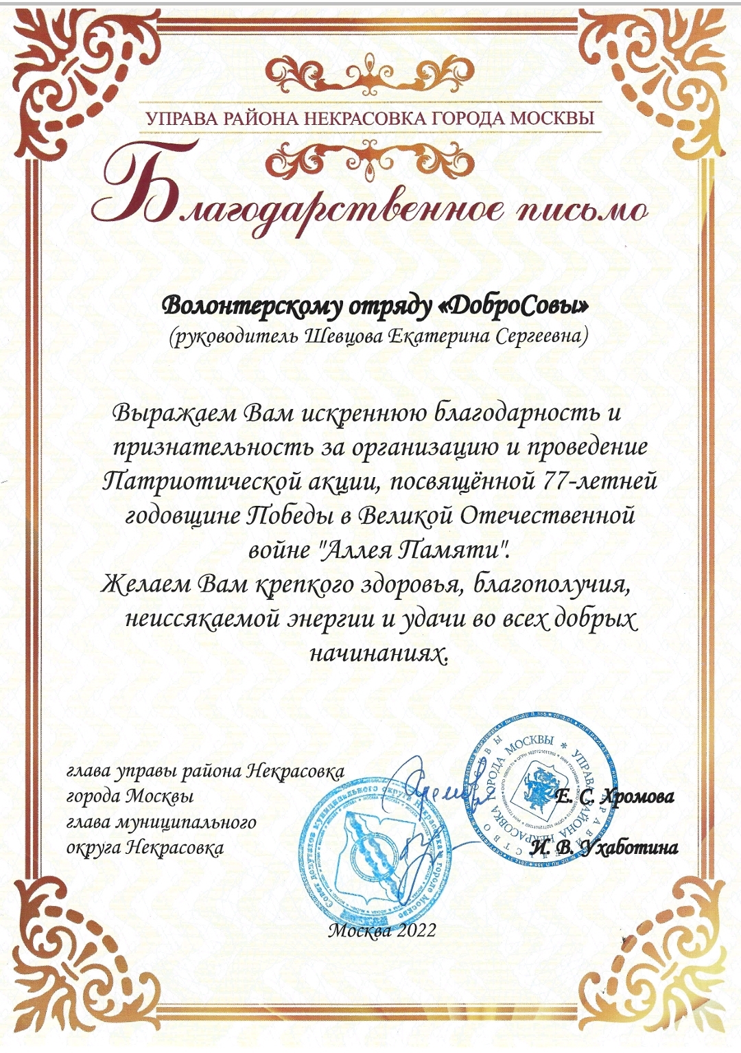 В 2021-2022 учебном году проект «Аллея памяти» кедровая аллея полностью реализован на территории Патриаршего подворья храма Покрова Пресвятой Богородицы на Люберецких полях. На территории изначально посажено 24 дерева в честь участников и героев Великой Отечественной войны, в честь которых названы улицы по Юго-Восточному административному округу города Москвы.