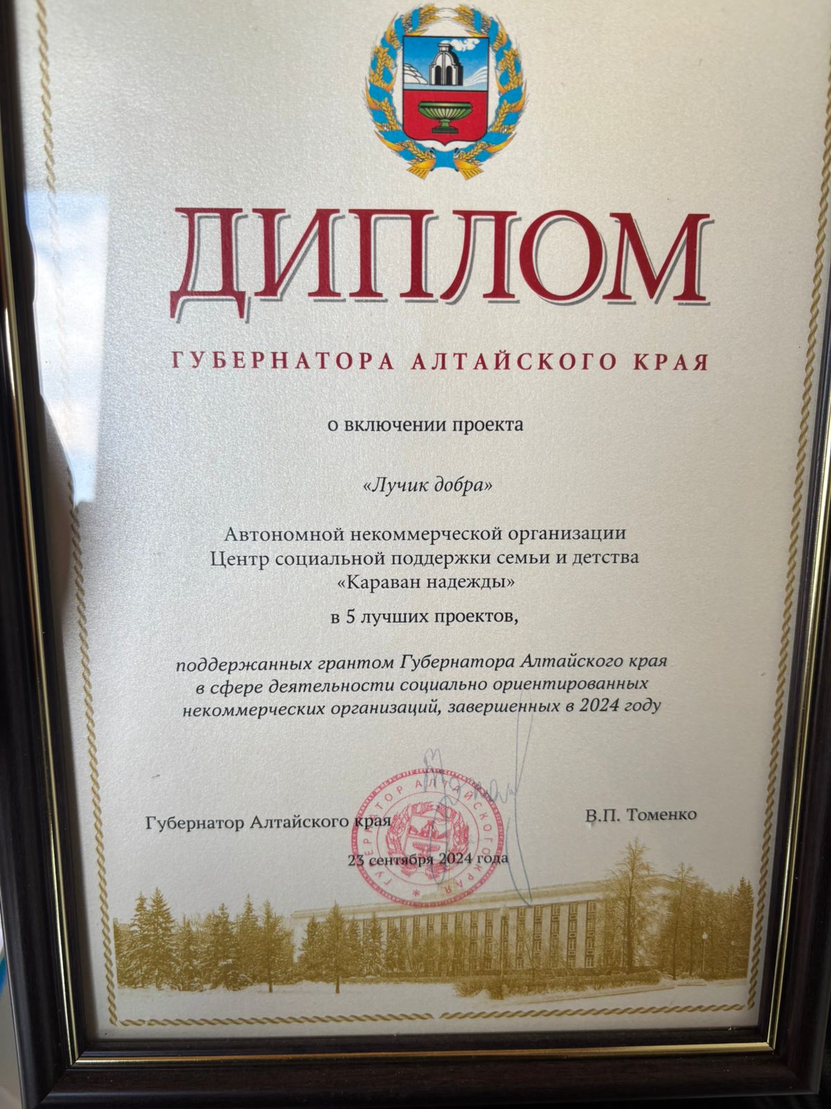 «Лучик добра» стал победителем конкурса грантов Губернатора Алтайского края в сфере СОНКО и дважды Фонда Президентских гарнтов, что подтверждает высокое качество и значимость проекта.