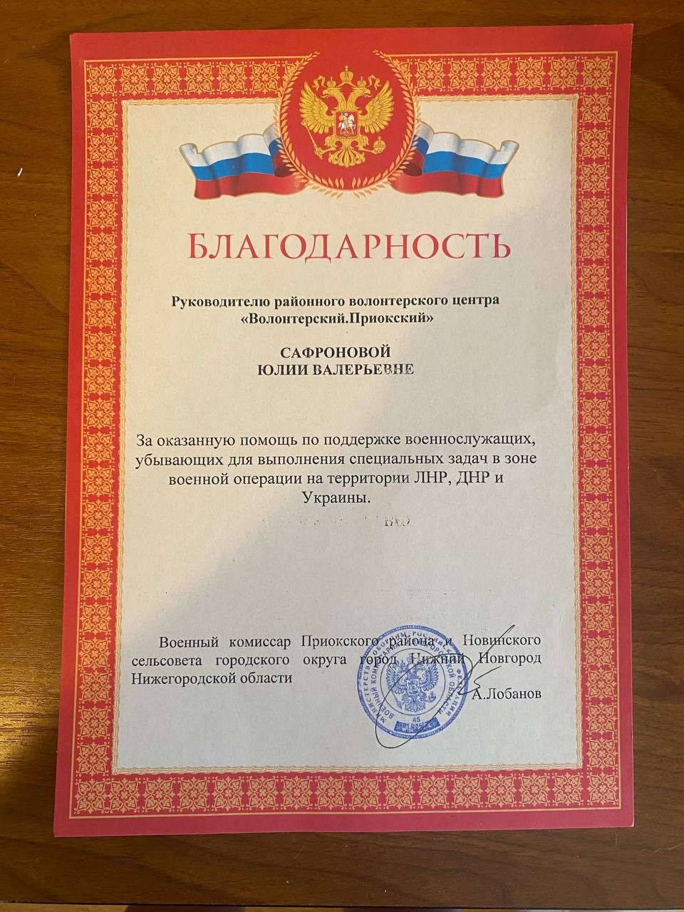 Было изготовлено 5 сетей, 500 окопных свечей, 2000 наборов сухой душ, 20 браслетов паракорд. Собрана гуманитарная помощь более чем на 100 т.р. Все было отправлено в зону СВО. Проведено 10 мастер классов в Соседских центрах Нижнего Новгорода, в которых приняло участие более 150 человек. Численность участников школьного волонтерского центра увеличилась с 31 до 55 обучающихся.